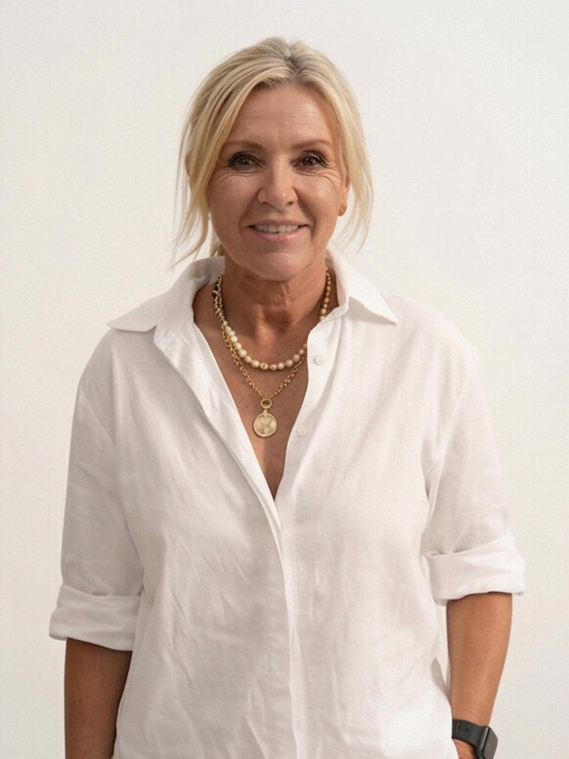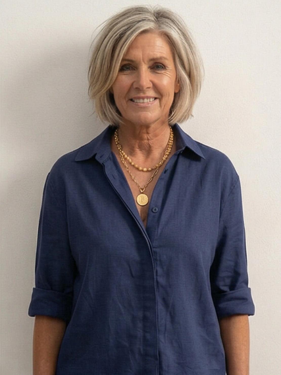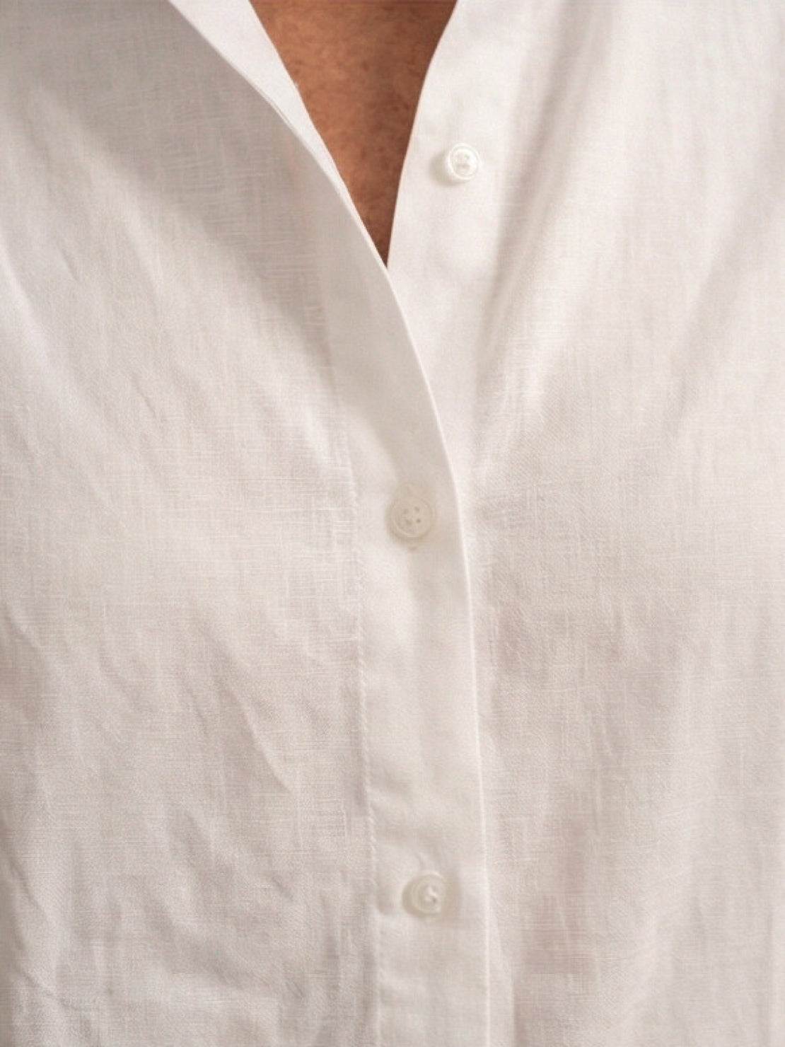 • Relaxed button-down shirt: Classic collar, easy longline shape, and roll-tab sleeves for that effortless “styled but chill” look.
